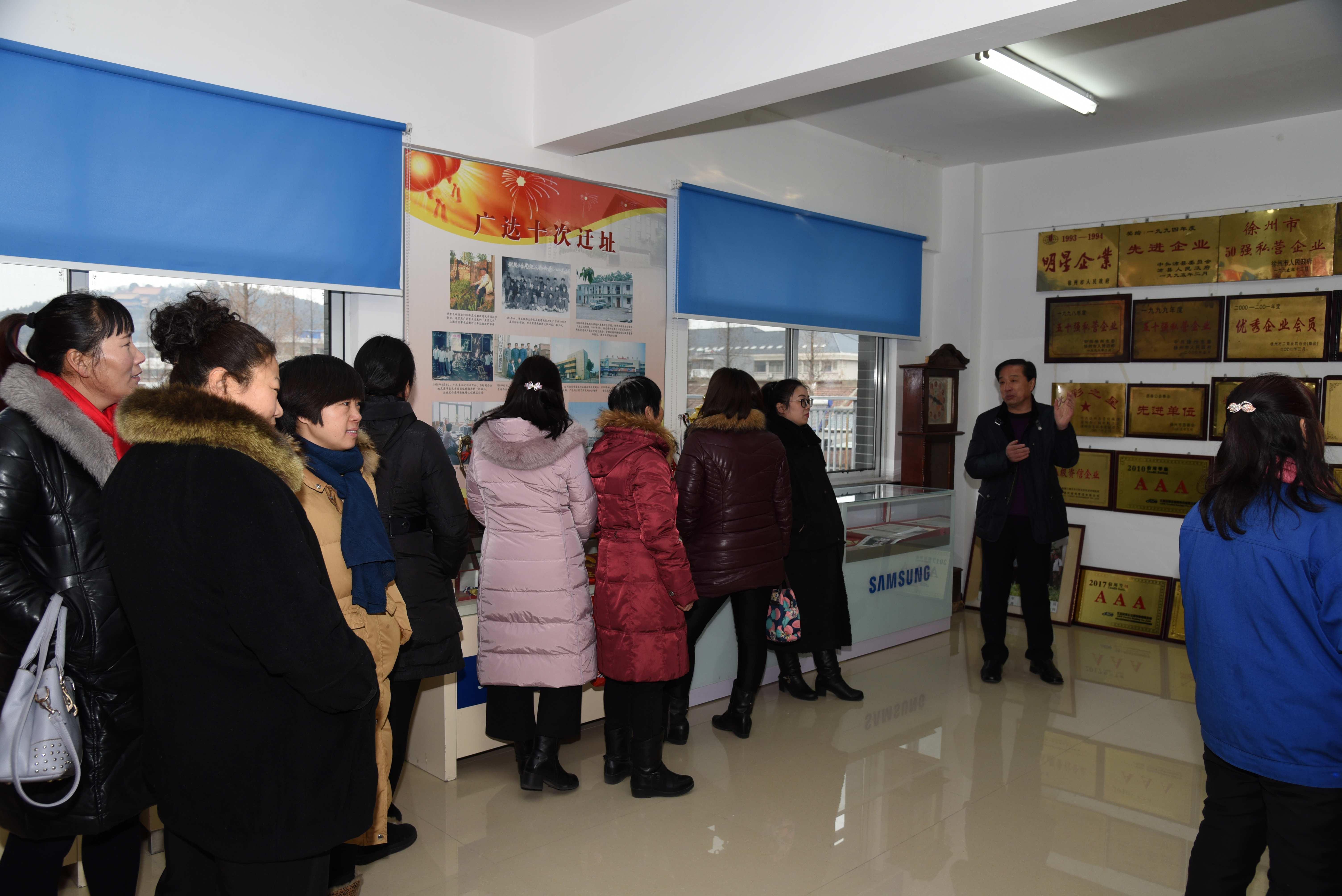 参加座谈会的家属代表参观公司了荣誉室、收藏室、武馆、办公楼和党员活动室,通过观看宣传片了解集团的发展历程。