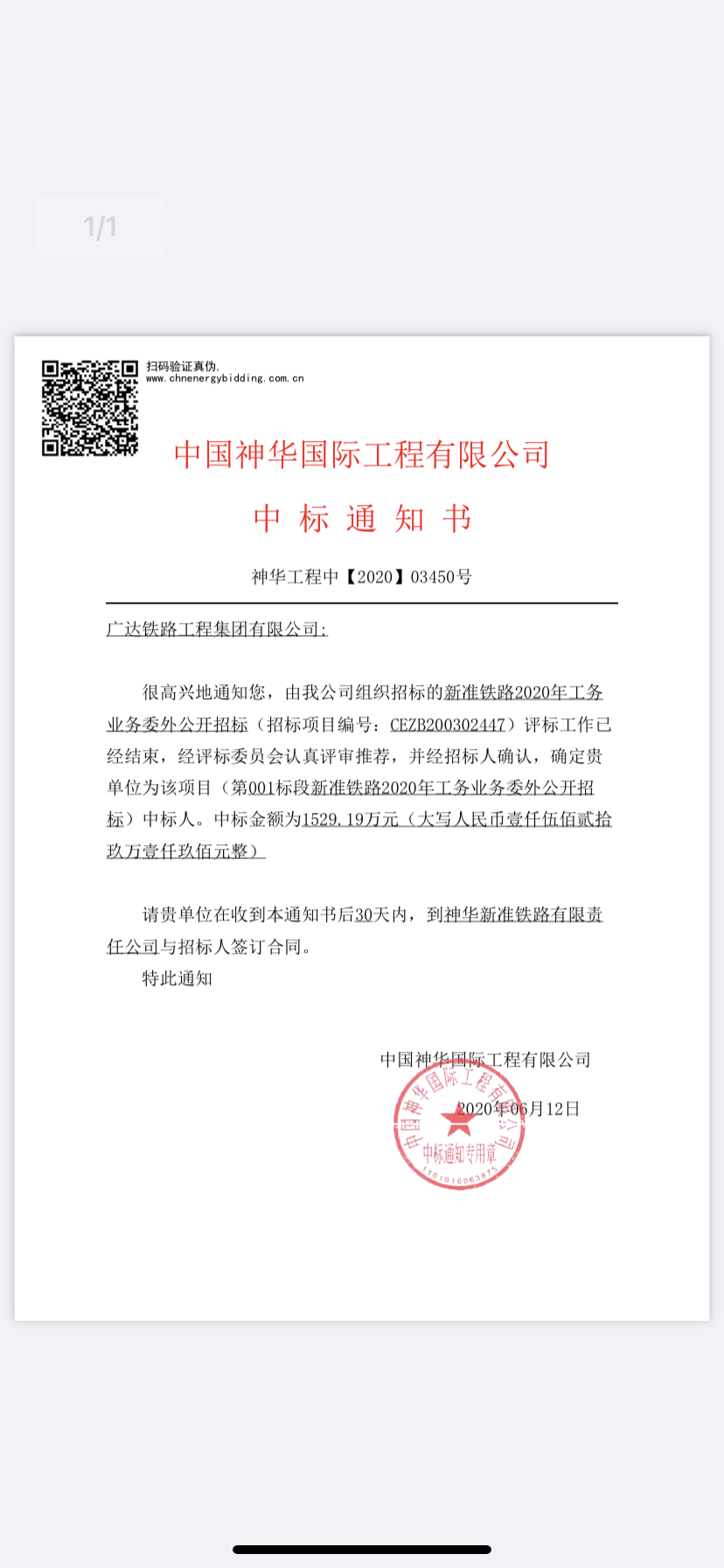 中国神华国际工程有限公司 新准线路 中 标 通 知 书